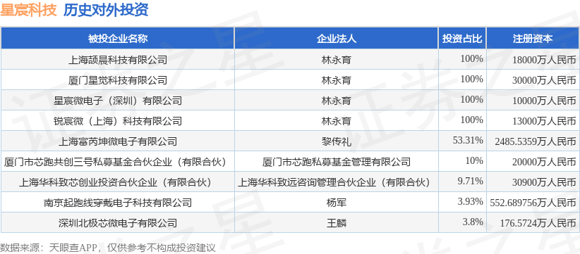 证券之星消息,根据天眼查APP显示,星宸科技(301536.SZ)新增一起对外投资事件,被投资公司为上海富芮坤微电子有限公司,法定代表人黎传礼,投资占比为53.31%。该公司从事软件和信息技术服务业,注册资本为2485.5359万人民币。目前,星宸科技共存在对外投资9项,详见下表: