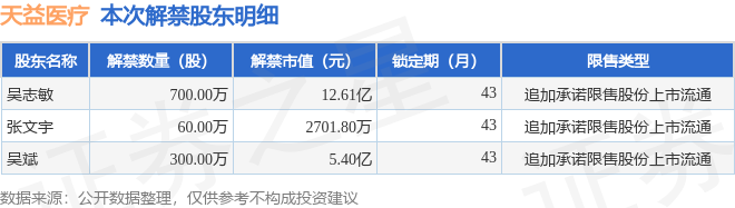 证券之星消息,根据市场公开信息整理,天益医疗(301097)于10月24日将有1060.0万股限售股份解禁,为公司追加承诺限售股份上市流通,占公司总股本17.98%。(本次数据根据历史公告整理得出,实际情况以上市公司最新公告为准)本次解禁后,公司还有3000.0万股限售股份,占总股本50.89%。具体如下图所示: