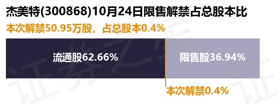 证券之星消息,根据市场公开信息整理,杰美特(300868)于10月24日将有50.95万股限售股份解禁,为公司股权激励限售股份,占公司总股本0.4%。(本次数据根据历史公告整理得出,实际情况以上市公司最新公告为准)本次解禁后,公司还有4726.22万股限售股份,占总股本36.94%。具体如下图所示:
