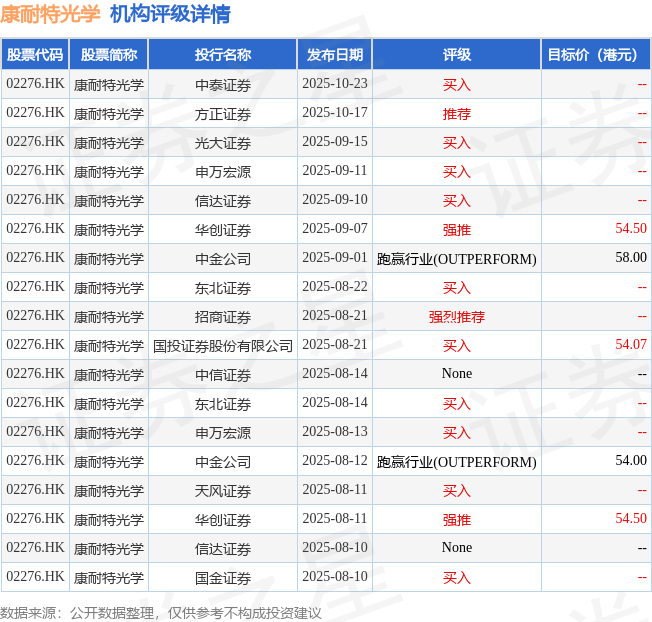 投行对该股的评级以买入为主,近90天内共有10家投行给出买入评级,近90天的目标均价为55.01港元。中泰证券最新一份研报给予康耐特光学买入评级。