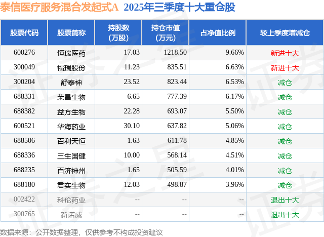 根据2025基金Q3季报公募基金重仓股数据,重仓该股的公募基金共1家,其中持有数量最多的公募基金为泰信基金的泰信医疗服务混合发起式A。泰信医疗服务混合发起式A目前规模为0.32亿元,最新净值1.1766(10月23日),较上一交易日下跌2.45%,近一年上涨27.61%。该公募基金现任基金经理为陈颖。陈颖在任的基金产品包括:泰信行业精选混合A,管理时间为2024年5月29日至今,期间收益率为6.46%;泰信互联网+主题混合A,管理时间为2025年8月18日至今,期间收益率为-11.74%;泰信中证A500指数增强A,管理时间为2025年9月23日至今,期间收益率为0.13%。