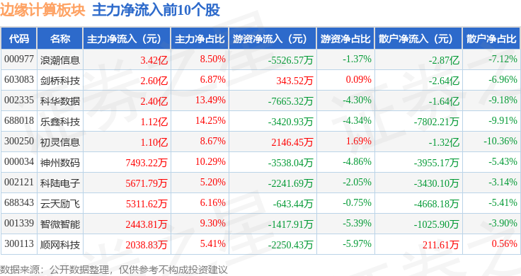从资金流向上来看,当日边缘计算板块主力资金净流入1.35亿元,游资资金净流出653.36万元,散户资金净流出1.29亿元。边缘计算板块个股资金流向见下表: