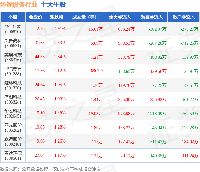 个股表现方面,环保设备行业当日领涨股为*ST节能(000820),该股当日报收2.78,上涨4.91%,成交量15.61万,主力资金净流入638.24万元。久吾高科(300631)以上涨2.53%紧随其后,该股当日成交量5.09万,主力资金净流入979.53万元。除此之外,美埃科技(688376)、*ST清研(301288)、楚环科技(001336)均进入当日牛股之列。具体个股列表见下表:
