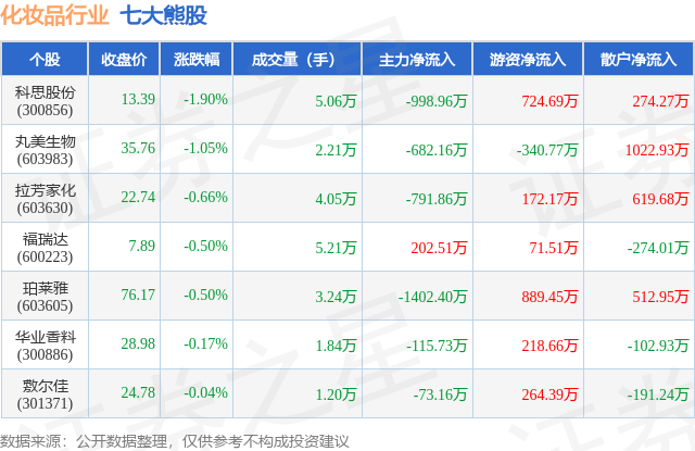 个股表现方面,化妆品行业当日领跌股为科思股份(300856),该股当日报收13.39,下跌1.9%,成交量5.06万,主力资金净流出998.96万元。丸美生物(603983)以下跌1.05%紧随其后,该股当日成交量2.21万,主力资金净流出682.16万元。除此之外,拉芳家化(603630)、福瑞达(600223)、珀莱雅(603605)均进入当日熊股之列。具体个股列表见下表: