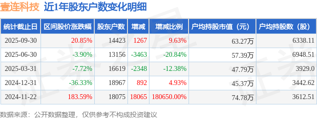 从股价来看,2025年6月30日至2025年9月30日,壹连科技区间涨幅为20.85%,在此期间股东户数增加1267.0户,增幅为9.63%。
