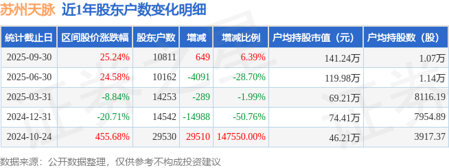 从股价来看,2025年6月30日至2025年9月30日,苏州天脉区间涨幅为25.24%,在此期间股东户数增加649.0户,增幅为6.39%。
