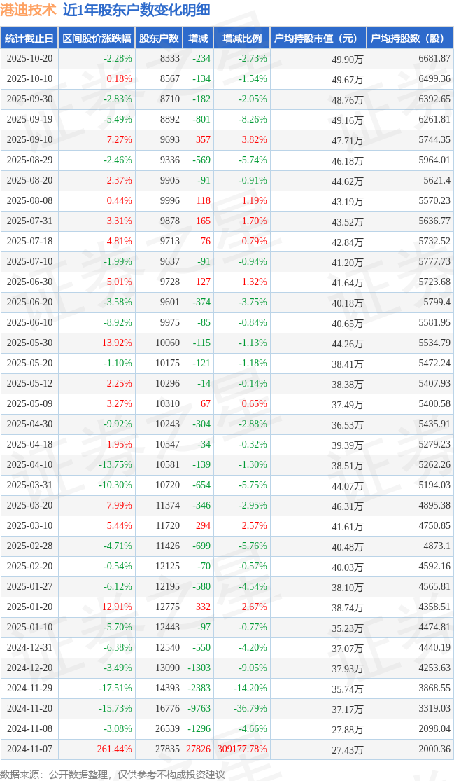 从股价来看,2025年10月10日至2025年10月20日,港迪技术区间跌幅为2.28%,在此期间股东户数减少234.0户,减幅为2.73%。