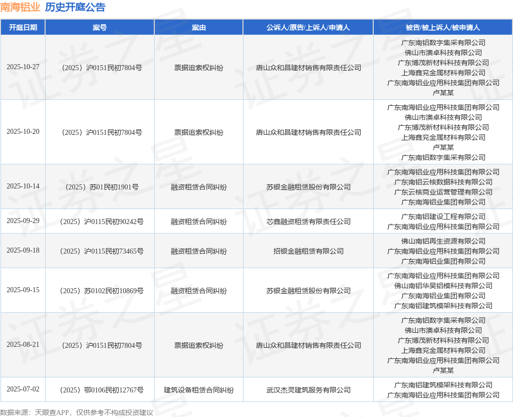 案号:(2025)沪0151民初7804号根据统计,近一年内以广东南海铝业应用科技集团有限公司为当事人的历史开庭公告有8则,其中案由为“融资租赁合同纠纷”的公告以4则居首,其次为“票据追索权纠纷”有3则,“建筑设备租赁合同纠纷”有1则。历史开庭公告如下: