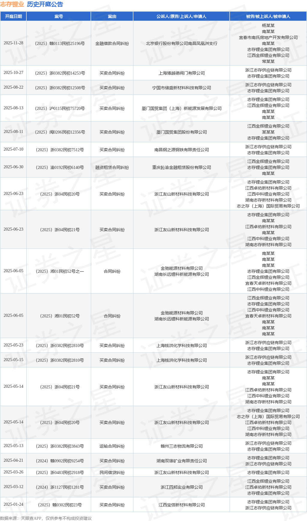 案号:(2025)浙0382民初14253号根据统计,近一年内以志存锂业集团有限公司为当事人的历史开庭公告有26则,其中案由为“买卖合同纠纷”的公告以20则居首,其次为“合同纠纷”有2则,“民间借贷纠纷”有1则。历史开庭公告(前20条)如下: