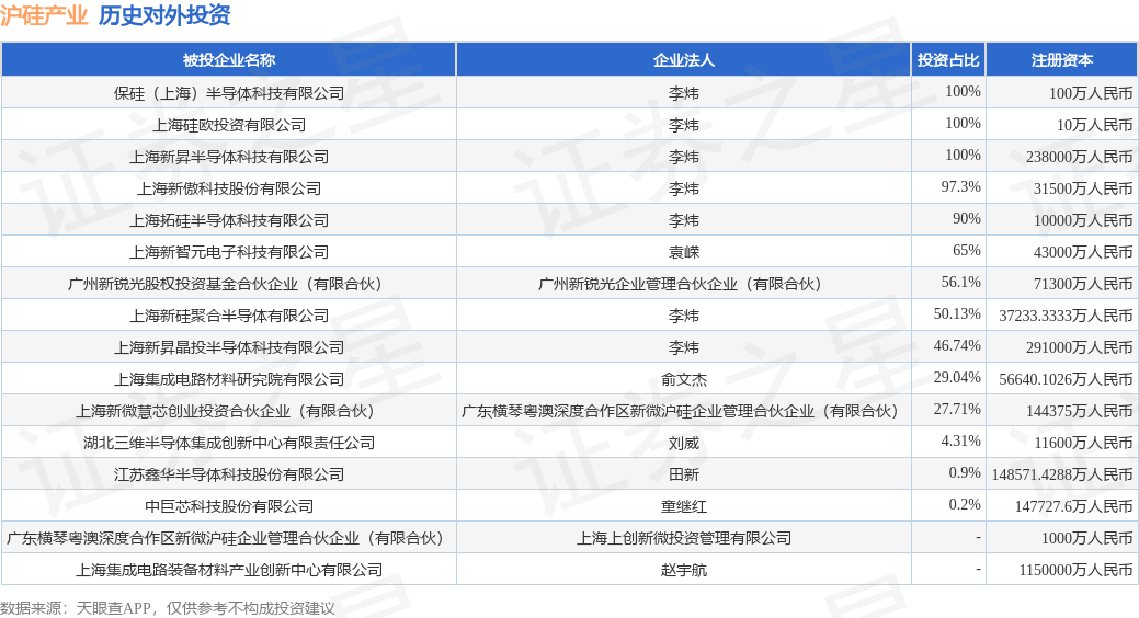 证券之星消息,根据天眼查APP显示,沪硅产业(688126.SH)新增一起对外投资事件,被投资公司为上海新昇晶投半导体科技有限公司,法定代表人李炜,投资占比为46.74%。该公司从事科技推广和应用服务业,注册资本为291000万人民币。目前,沪硅产业共存在对外投资16项,详见下表: