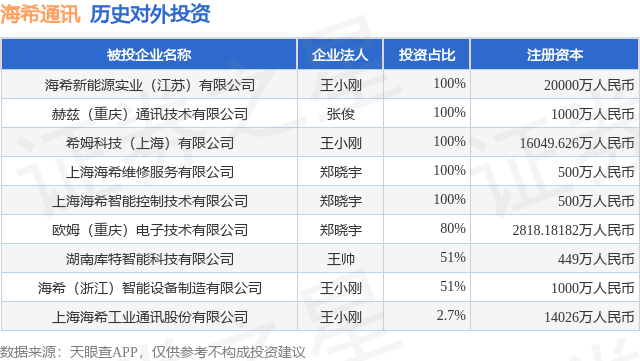 证券之星消息,根据天眼查APP显示,海希通讯(920405.BJ)新增一起对外投资事件,被投资公司为海希新能源实业(江苏)有限公司,法定代表人王小刚,投资占比为100%。该公司从事电气机械和器材制造业,注册资本为20000万人民币。目前,海希通讯共存在对外投资9项,详见下表: