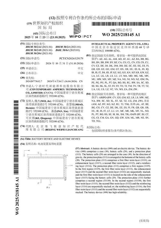 证券之星消息,根据企查查数据显示宁德时代(300750)公布了一项国际专利申请,专利名为“电池装置及用电装置”,专利申请号为PCT/CN2024/129179,国际公布日为2025年10月23日。