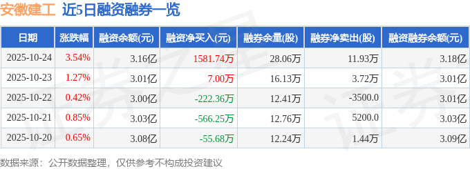 安徽建工融资融券信息显示,融资方面,当日融资买入5302.03万元,融资偿还3720.3万元,融资净买入1581.74万元。融券方面,融券卖出14.16万股,融券偿还2.23万股,融券余量28.06万股,融券余额139.46万元。融资融券余额3.18亿元。
