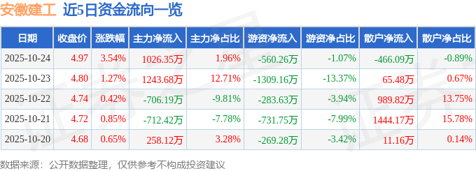 证券之星消息,截至2025年10月24日收盘,安徽建工(600502)报收于4.97元,上涨3.54%,换手率6.06%,成交量103.94万手,成交额5.25亿元。