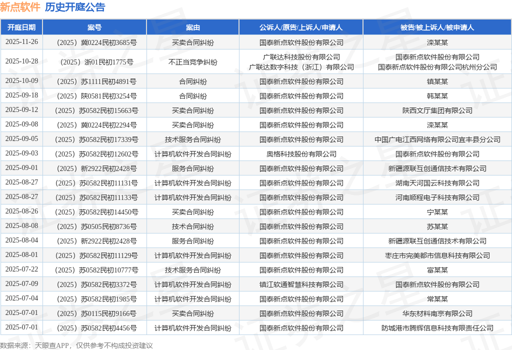案号:(2025)浙01民初1775号根据统计,近一年内以国泰新点软件股份有限公司为当事人的历史开庭公告有117则,其中案由为“计算机软件开发合同纠纷”的公告以54则居首,其次为“买卖合同纠纷”有23则,“技术服务合同纠纷”有15则。历史开庭公告(前20条)如下: