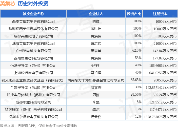 证券之星消息,根据天眼查APP显示,英集芯(688209.SH)新增一起对外投资事件,被投资公司为安义龙昌创业投资合伙企业(有限合伙),法定代表人海南东方丰海私募基金管理有限公司,投资占比为35.65%。该公司从事资本市场服务,注册资本为28050万人民币。目前,英集芯共存在对外投资14项,详见下表: