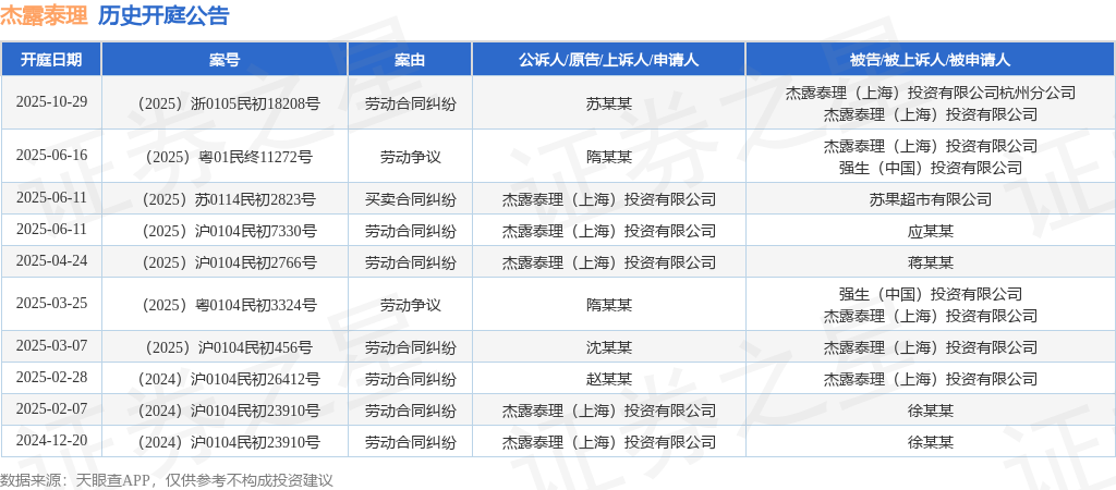 案号:(2025)浙0105民初18208号根据统计,近一年内以杰露泰理(上海)投资有限公司为当事人的历史开庭公告有10则,其中案由为“劳动合同纠纷”的公告以7则居首,其次为“劳动争议”有2则,“买卖合同纠纷”有1则。历史开庭公告如下: