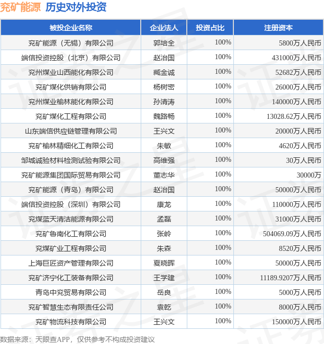 通过天眼查大数据分析,兖矿能源集团股份有限公司共对外投资了60家企业,参与招投标项目24574次;财产线索方面有商标信息316条,专利信息2308条,著作权信息62条;此外企业还拥有行政许可48个。据2024年报数据,兖矿能源商誉2.97亿元,同比减6.82%。长期股权投资256.43亿元,同比增6.88%。