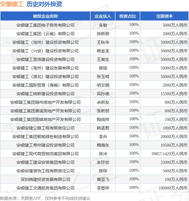 通过天眼查大数据分析,安徽建工集团股份有限公司共对外投资了148家企业,参与招投标项目31445次;财产线索方面有商标信息5条,专利信息271条,著作权信息64条;此外企业还拥有行政许可736个。据2024年报数据,安徽建工商誉1438.47万元,同比增1999.62%。长期股权投资13.11亿元,同比增23.61%。