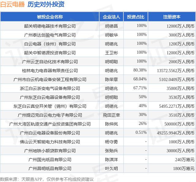 证券之星消息,根据天眼查APP显示,白云电器(603861.SH)新增一起对外投资事件,被投资公司为韶关明德电器技术有限公司,法定代表人胡德昌,投资占比为100%。该公司从事电气机械和器材制造业,注册资本为12000万人民币。目前,白云电器共存在对外投资17项,详见下表:
