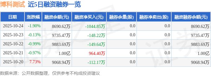 博科测试融资融券信息显示,融资方面,当日融资买入1005.88万元,融资偿还2050.73万元,融资净偿还1044.85万元。融券方面,融券卖出0.0股,融券偿还0.0股,融券余量0.0股,融券余额0.0万元。融资融券余额8690.62万元。