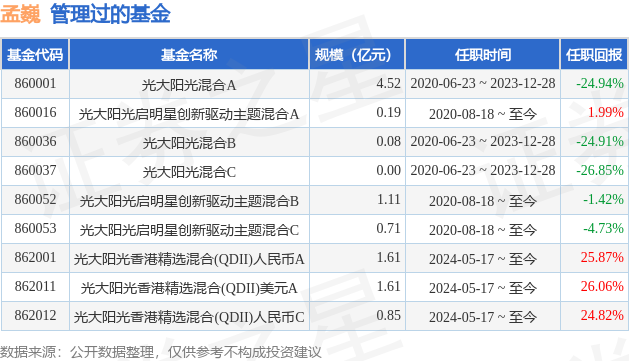 证券之星消息,2025年10月27日,光大阳光对冲6个月持有混合(860010)发布公告,增聘孟巍为基金经理,任职日期自2025年10月27日起,陈韵骋不再担任该基金基金经理,离任日期为2025年10月27日,变更后光大阳光对冲6个月持有混合(860010)的基金经理为孟巍。截止2025年10月24日,光大阳光对冲6个月持有混合净值为1.1170,较上一日下跌0.13%,近一年上涨2.86%。