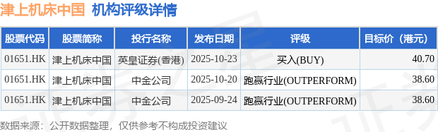 投行对该股的评级以跑赢行业(OUTPERFORM)为主,近90天内共有2家投行给出跑赢行业(OUTPERFORM)评级,近90天的目标均价为39.3港元。英皇证券(香港)最新一份研报给予津上机床中国买入(BUY)评级,目标价40.7港元。