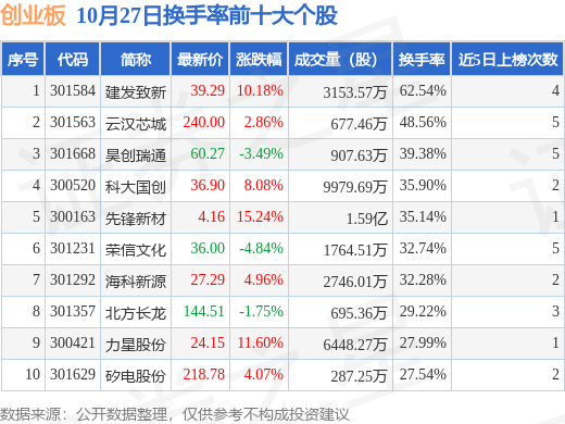 当日创业板换手率前10大个股中7只个股收涨,平均涨幅8.14%,其中建发致新(301584)以换手率62.54%排第一,8只个股近5个交易日中多次上榜。