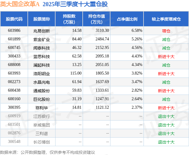 英大国企改革A的前十大重仓股如下: