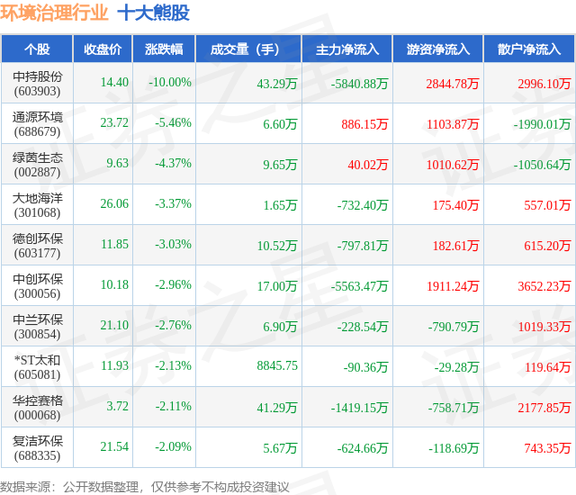 个股表现方面,环境治理行业当日领跌股为中持股份(603903),该股当日报收14.4,下跌10.0%,成交量43.29万,主力资金净流出5840.88万元。通源环境(688679)以下跌5.46%紧随其后,该股当日成交量6.6万,主力资金净流入886.15万元。除此之外,绿茵生态(002887)、大地海洋(301068)、德创环保(603177)均进入当日熊股之列。具体个股列表见下表: