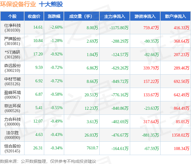 个股表现方面,环保设备行业当日领跌股为仕净科技(301030),该股当日报收14.61,下跌2.6%,成交量8.0万,主力资金净流出1175.8万元。严牌股份(301081)以下跌1.28%紧随其后,该股当日成交量2.69万,主力资金净流出288.29万元。除此之外,*ST清研(301288)、森远股份(300210)、中材节能(603126)均进入当日熊股之列。具体个股列表见下表: