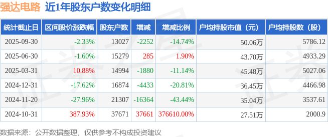 从股价来看,2025年6月30日至2025年9月30日,强达电路区间跌幅为2.33%,在此期间股东户数减少2252.0户,减幅为14.74%。