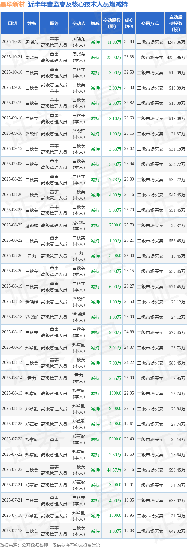 晶华新材近半年内的董监高及核心技术人员增减持详情如下: