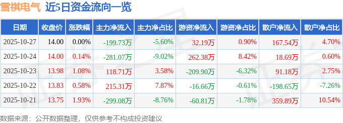 证券之星消息,截至2025年10月27日收盘,雪祺电气(001387)报收于14.0元,上涨0.0%,换手率2.24%,成交量2.55万手,成交额3567.39万元。