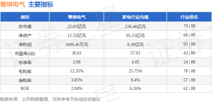 雪祺电气2025年中报显示,公司主营收入8.97亿元,同比下降3.92%;归母净利润3499.46万元,同比下降10.26%;扣非净利润3329.39万元,同比下降13.78%;其中2025年第二季度,公司单季度主营收入4.55亿元,同比下降8.35%;单季度归母净利润1595.82万元,同比下降25.5%;单季度扣非净利润1519.29万元,同比下降26.52%;负债率41.35%,投资收益141.16万元,财务费用-674.93万元,毛利率12.35%。雪祺电气(001387)主营业务:从事冰箱和商用展示柜的研发、生产与销售业务。