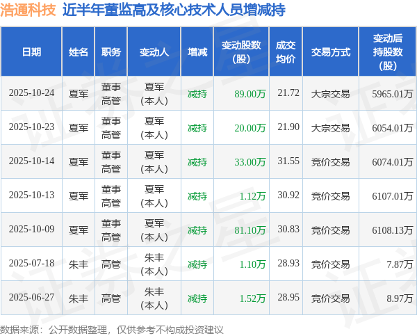浩通科技近半年内的董监高及核心技术人员增减持详情如下: