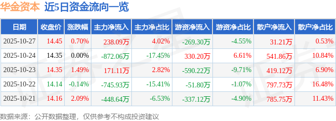 证券之星消息,截至2025年10月27日收盘,华金资本(000532)报收于14.45元,上涨0.7%,换手率1.2%,成交量4.11万手,成交额5924.85万元。