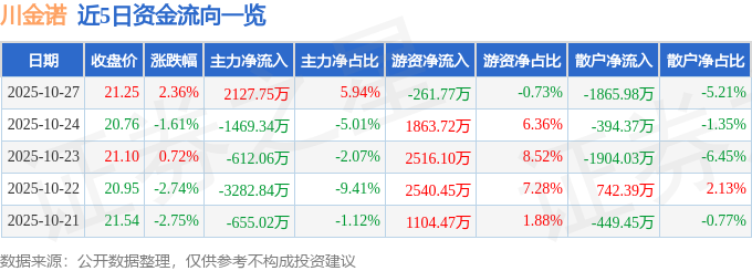 证券之星消息,截至2025年10月27日收盘,川金诺(300505)报收于21.25元,上涨2.36%,换手率7.76%,成交量16.87万手,成交额3.58亿元。