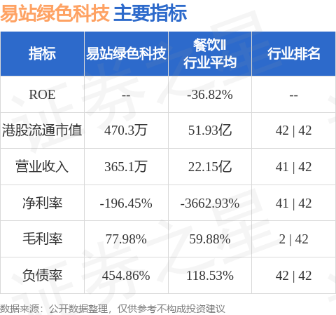 易站绿色科技港股市值470.3万港元,在餐饮Ⅱ行业中排名第42。主要指标见下表: