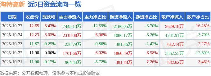 证券之星消息,截至2025年10月27日收盘,海特高新(002023)报收于12.65元,上涨3.43%,换手率6.31%,成交量46.72万手,成交额5.91亿元。