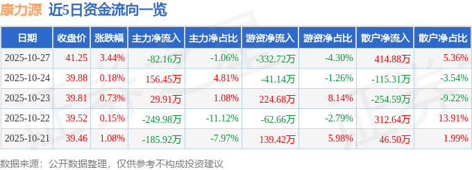 证券之星消息,截至2025年10月27日收盘,康力源(301287)报收于41.25元,上涨3.44%,换手率11.11%,成交量1.89万手,成交额7746.24万元。