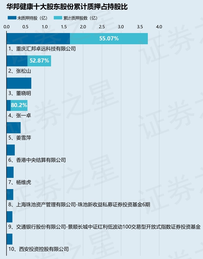 截止本公告日,股东重庆汇邦卓远科技有限公司已累计质押股份2.04亿股,占其持股总数的55.07%,股东张松山已累计质押股份6191.0万股,占其持股总数的52.87%,股东张一卓已累计质押股份4416.0万股,占其持股总数的80.2%。本次质押后华邦健康十大股东的累计质押股份占持股比例(占持股比例的计算以公司最新一期财务报表公布的十大股东的持股总数为基准)见下图: