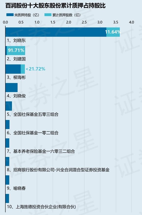 截止本公告日,股东刘晓东已累计质押股份4220.0万股,占其持股总数的11.64%,股东刘建国已累计质押股份5778.0万股,占其持股总数的91.71%,股东柳海彬已累计质押股份1350.0万股,占其持股总数的21.72%。本次质押后百润股份十大股东的累计质押股份占持股比例(占持股比例的计算以公司最新一期财务报表公布的十大股东的持股总数为基准)见下图: