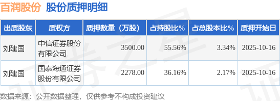 证券之星消息,百润股份(002568)10月28日公开信息显示,股东刘建国向中信证券股份有限公司、国泰海通证券股份有限公司合计质押5778.0万股,占总股本5.51%。质押详情见下表:
