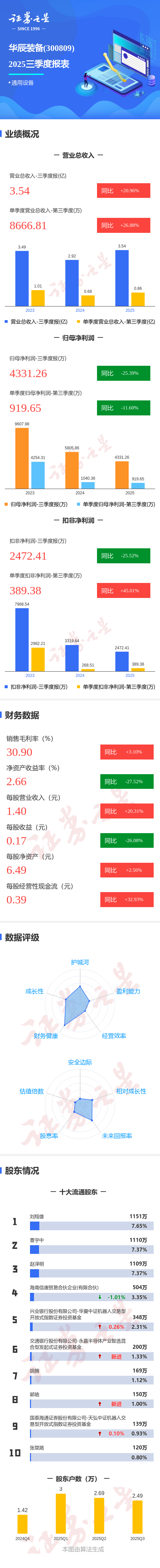 证券之星消息,华辰装备2025年三季报显示,公司主营收入3.54亿元,同比上升20.96%;归母净利润4331.26万元,同比下降25.4%;扣非净利润2472.41万元,同比下降25.52%;其中2025年第三季度,公司单季度主营收入8666.81万元,同比上升26.89%;单季度归母净利润919.65万元,同比下降11.6%;单季度扣非净利润389.38万元,同比上升45.01%;负债率25.71%,投资收益988.37万元,财务费用-181.18万元,毛利率30.9%。