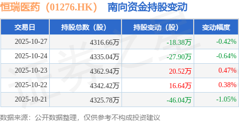 证券之星消息,10月27日南向资金减持18.38万股恒瑞医药(01276.HK)。近5个交易日中,获南向资金减持的有3天,累计净减持55.16万股。近20个交易日中,获南向资金增持的有13天,累计净增持463.24万股。截至目前,南向资金持有恒瑞医药(01276.HK)4316.66万股,占公司已发行普通股的16.71%。