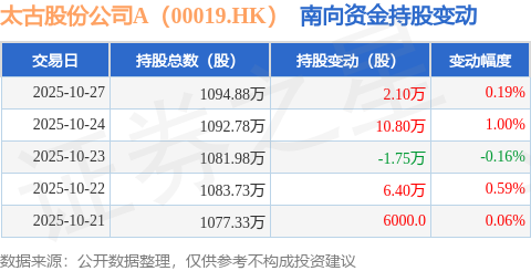 证券之星消息,10月27日南向资金增持2.1万股太古股份公司A(00019.HK)。近5个交易日中,获南向资金增持的有4天,累计净增持18.15万股。近20个交易日中,获南向资金增持的有13天,累计净增持65.2万股。截至目前,南向资金持有太古股份公司A(00019.HK)1094.88万股,占公司已发行普通股的1.39%。