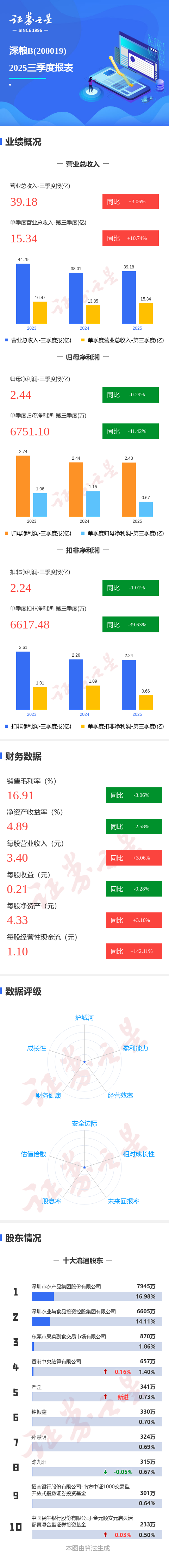 证券之星消息,深粮B2025年三季报显示,公司主营收入39.18亿元,同比上升3.07%;归母净利润2.44亿元,同比下降0.3%;扣非净利润2.24亿元,同比下降1.01%;其中2025年第三季度,公司单季度主营收入15.34亿元,同比上升10.74%;单季度归母净利润6751.1万元,同比下降41.42%;单季度扣非净利润6617.48万元,同比下降39.63%;负债率28.82%,投资收益-201.62万元,财务费用2461.57万元,毛利率16.91%。