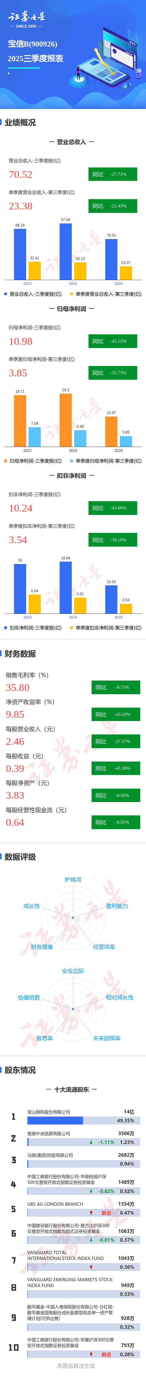 证券之星消息,宝信B2025年三季报显示,公司主营收入70.52亿元,同比下降27.72%;归母净利润10.98亿元,同比下降43.13%;扣非净利润10.24亿元,同比下降45.67%;其中2025年第三季度,公司单季度主营收入23.38亿元,同比下降22.43%;单季度归母净利润3.85亿元,同比下降35.73%;单季度扣非净利润3.54亿元,同比下降39.18%;负债率48.26%,投资收益1324.89万元,财务费用-1214.27万元,毛利率35.8%。