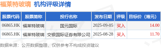 投行对该股的评级以买入为主,近90天内共有2家投行给出买入评级,近90天的目标均价为12.85港元。国元国际最新一份研报给予福莱特玻璃买入评级,目标价14港元。